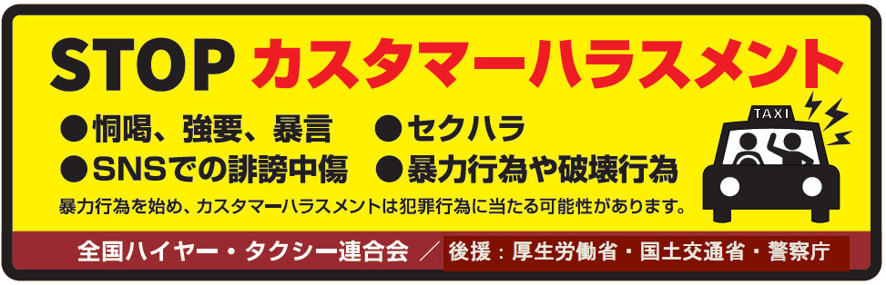 一方で、カスタマーハラスメントについてお客様対応に伴う単なるクレームとして扱いません。お客様からのさまざまな「要求」が不当・悪質なクレーム、いわゆるカスタマーハラスメントと判断される場合、実際に対応する従業員を守るべく、精神的・身体的な苦痛を少しでも軽減するため、会社として積極的に対応するものであると考えます。そして、東宝タクシー株式会社で働くすべての従業員が安全に、安心して勤務できるよう就業環境の維持改善に取り組みます。